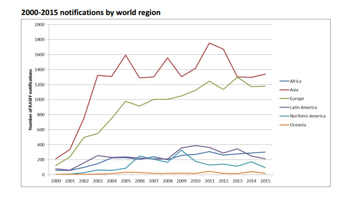Así, Italia tuvo un total de 512 notificaciones del RASFF en 2015, Reino Unido 337, Francia 236, Alemania 276 y España 174. Por último, identificar que las notificaciones de productos procedentes de la zona asiática han disminuido considerablemente en los últimos años.