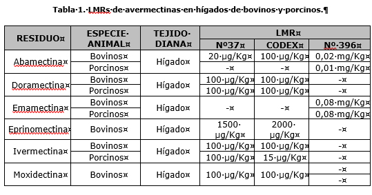 Así mismo, se ha especificado LMR (límite máximo de residuos) para dichos compuestos en el Reglamento (UE) Nº 37/2010 de la Comisión de 22 de diciembre de 2009 relativo a las sustancias farmacológicamente activas y su clasificación por lo que se refiere a los límites máximos de residuos en los productos alimenticios de origen animal y en el Codex Alimentarius (CODEX, 2015). Es destacable que la abamectina y la emamectina también aparecen legisladas en Reglamento (CE) n° 396/2005 del Parlamento Europeo y del Consejo, de 23 de febrero de 2005 relativo a los límites máximos de residuos de plaguicidas en alimentos y piensos de origen vegetal y animal y que modifica la Directiva 91/414/CEE del Consejo. Los valores especificados para cada compuesto en la matriz hígado, de bovinos y porcinos, se detallan en la tabla.
